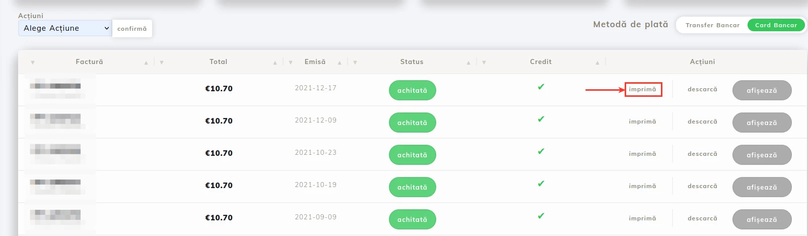 - Fakturaen vil kun være synlig i RON fra hostico.ro-versjonen (hostico.com-utvidelsen viser ikke fakturaer i lei);