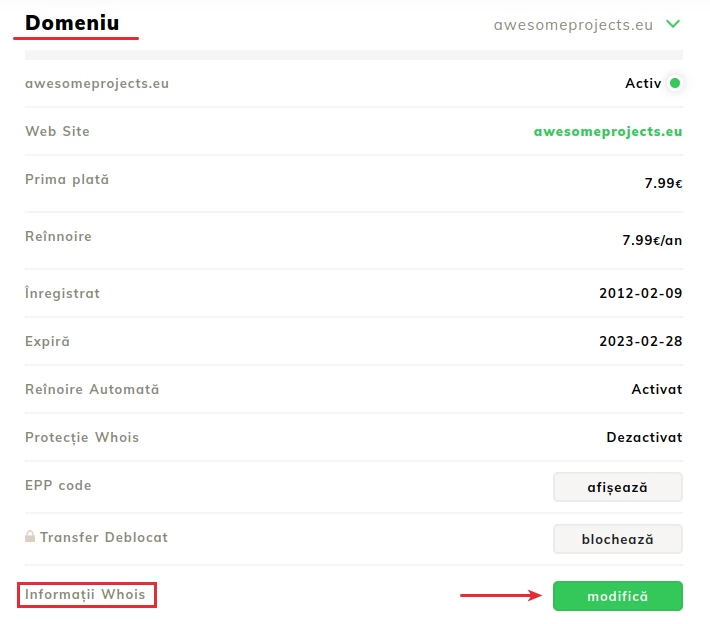 Etter å ha fått tilgang til domenet, vil vi på den nylig åpnete siden få tilgang til avsnittet Domen;- I denne seksjonen er WHOIS-informasjonen av interesse