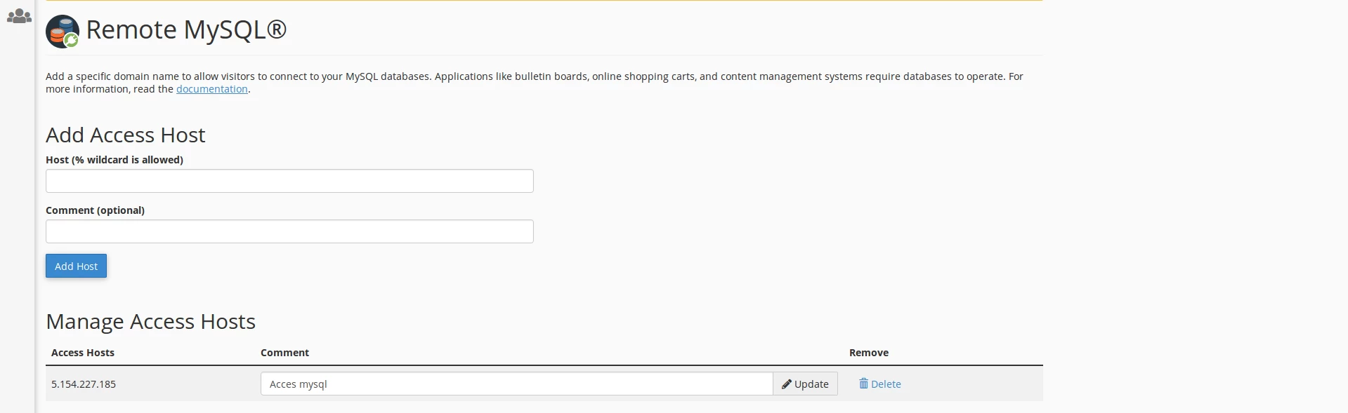 - I denne veiledningen vil vi vise deg hvordan du konfigurerer Remote MySQL® tilgang i cPanel-kontoen. Remote MySQL® tilgang er ikke aktivert som standard, og du må sende oss en e-post til help@hostico.com for aktivering, sammen med en IP-adresse fra hvilken forbindelsen vil bli gjort.