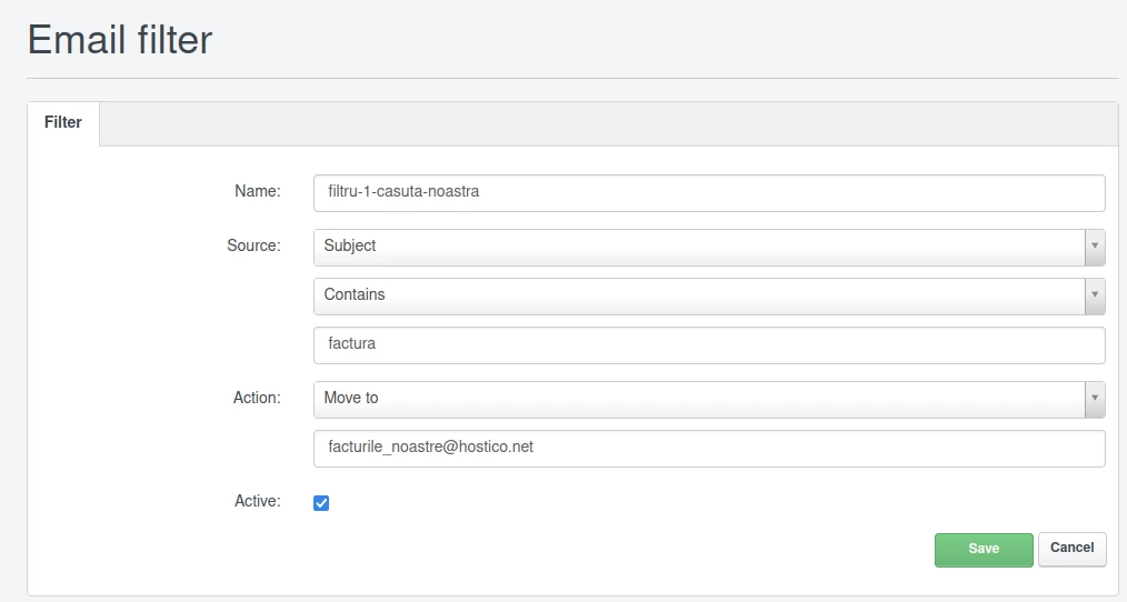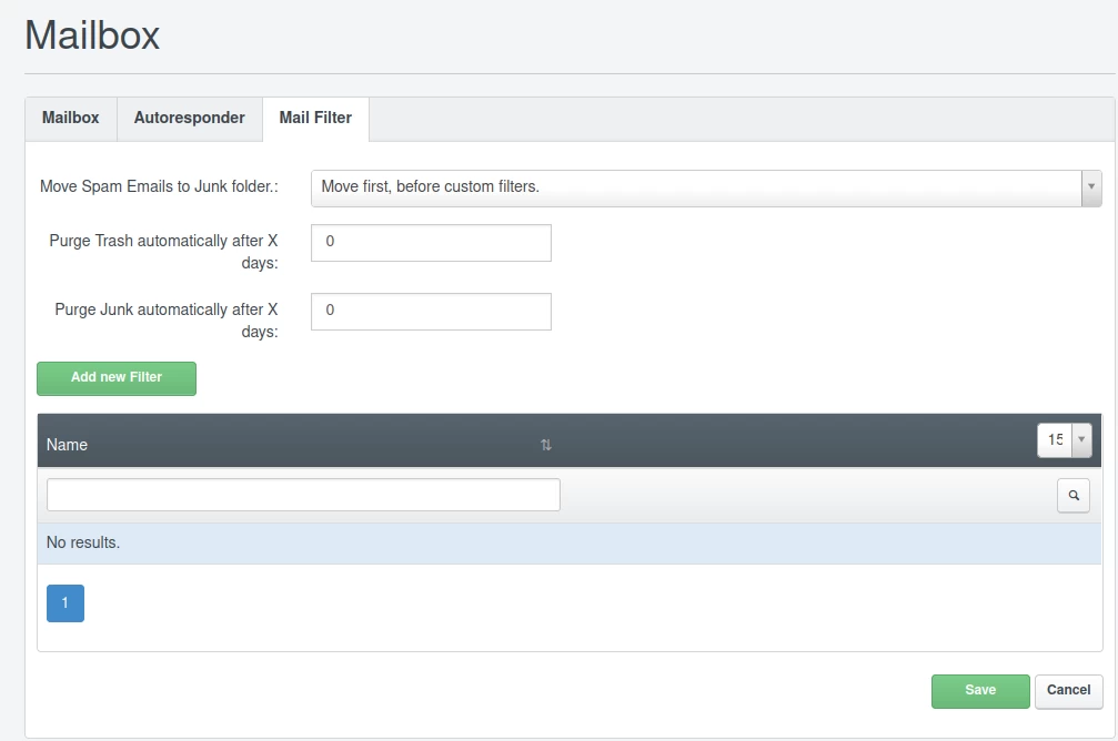 I fanen Mailfilter kan vi sette tilpassbare tilleggssfilter for e-postmeldingene som sendes til innboksen, som vil kjøre automatisk før de kommer inn i innboksen, og utføre forskjellige konfigurerbare handlinger fra Legg til nytt filter-knappen.