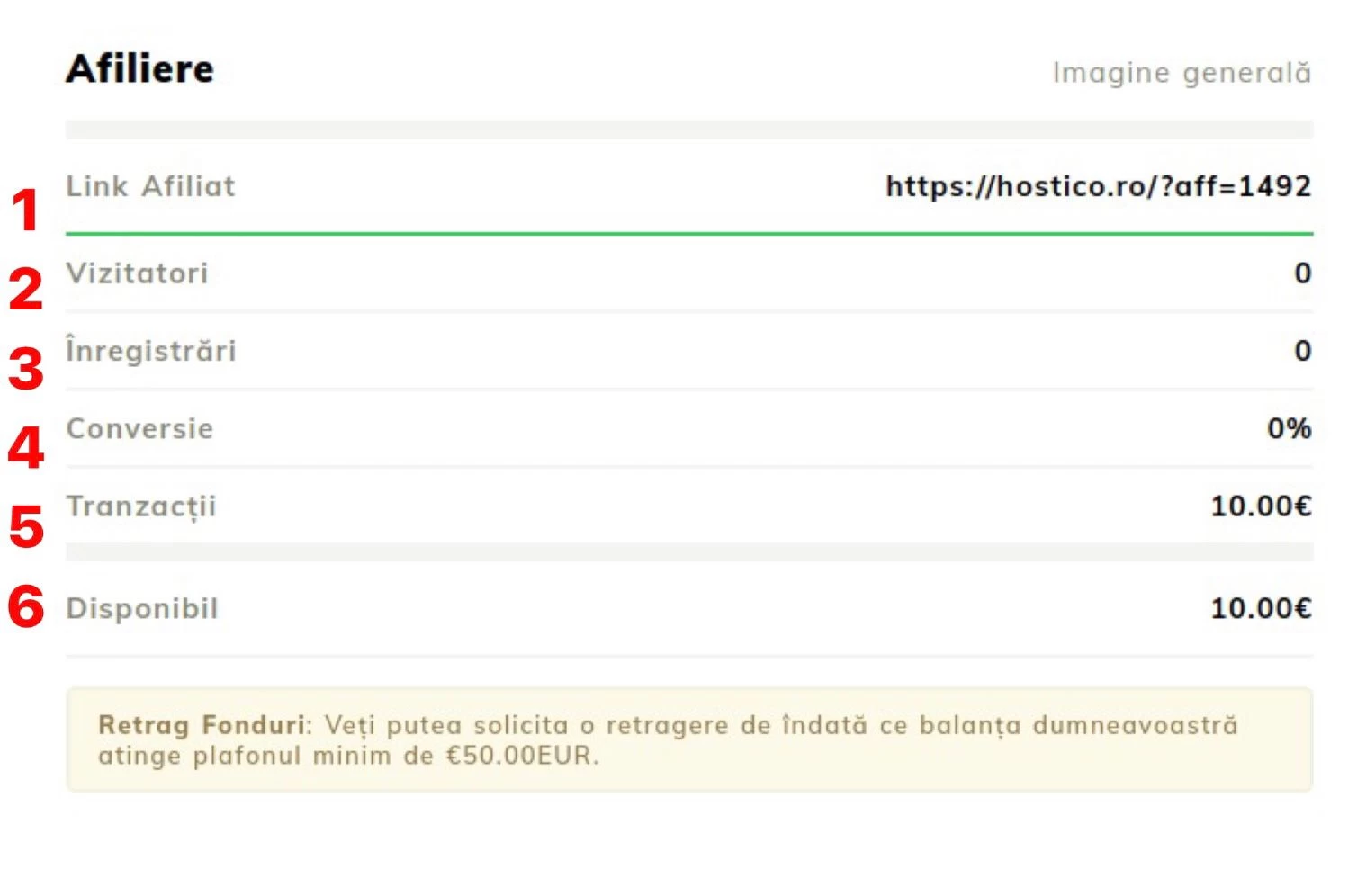 (1) Affiliate Link - bestillingsportalen for å søke om den tilsvarende provisjonen; - (2) Besøkende - antall besøkende som ble dirigert til Hostico ved å få tilgang til den unike affiliate-lenken;